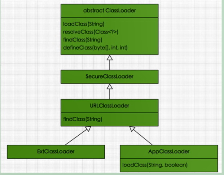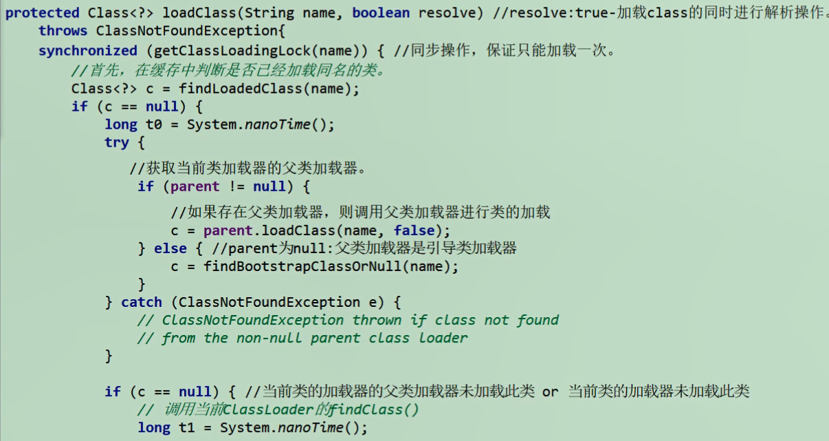 (1)loadClass()的解析  (2)protected findClass(String name) 查找二进制名称为name的类,返回结果为java.lang.Class类的实例 ,需要注意的是ClassLoader类中并没有实现findClass方法的具体代码逻辑,取而代之的是抛出ClassNotFoundException异常,同时应该知道是findClass方法通常和defineClass方法一起使用。一般情况下,在自定义类加载器时,会直接覆盖ClassLoader的findClass方法并编写加载规则,取得要加载类的字节码后转换成流,然后调用defineClass方法生成类的Class对象 (3)protected defineClass(String name,byte[] b,int off, int len) 该方法是用来将byte字节流解析成JVM能够识别的Class对象,通过这个方法不仅能够通过class文件实例化class对象,也可以通过其他方法实例化对象 (4)两个类加载方法的区别 ① Class.forName():是一个静态方法,该方法在将Class文件加载到内存的同时,会执行类的初始化 ② ClassLoader.loadClass():是一个实例方法,该方法将Class文件加载到内存的同时不会执行类的初始化,知道这个类第一次使用时才进行初始化 - 双亲委派模型