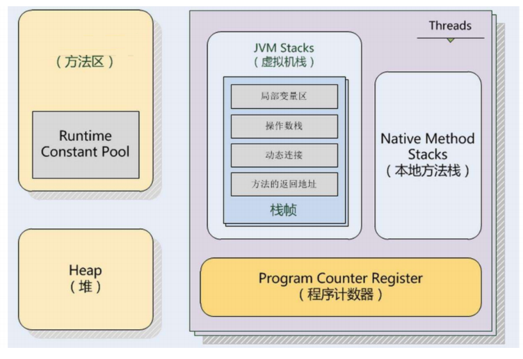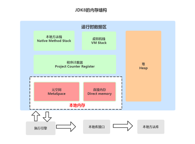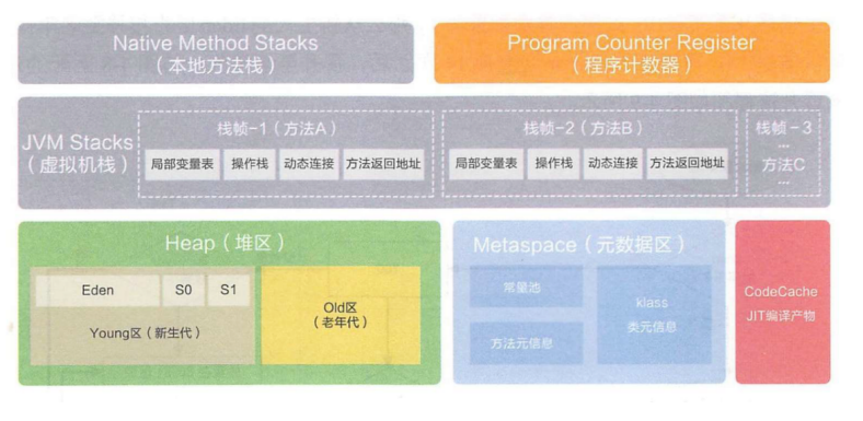 - 方法区:也被称为元空间,还有个别名 non-heap(非堆),使用本地内存存储 class meta-data 元数据(运行时常量池,字段和方法的数据,构造函数和方法的字节码等),在 JDK 8 中,把 interned String 和类静态变量移动到了 Java 堆