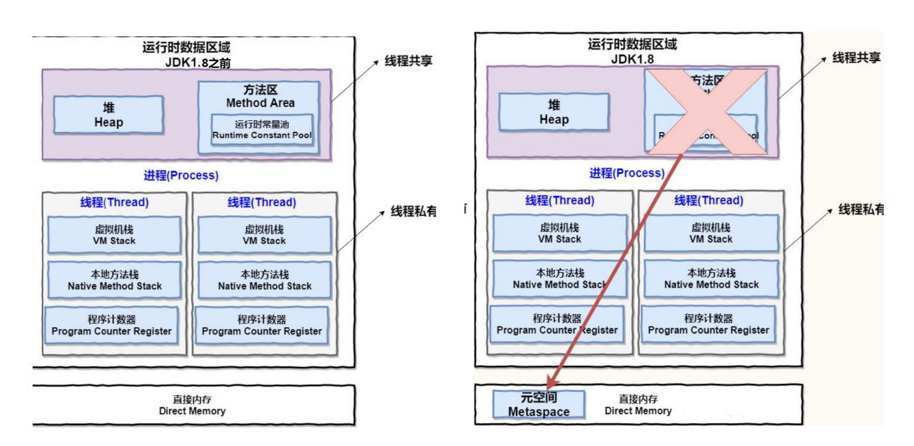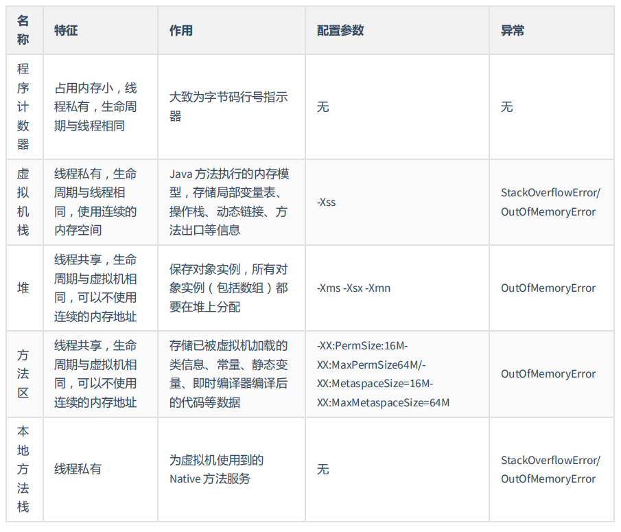 线程共享的: ①堆 ②方法区 直接内存(非运行时数据区的一部分)