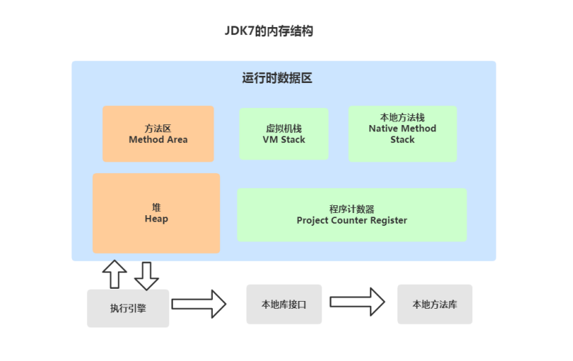 另外,还包括执行引擎所需的本地库(Native Method Libraries)和与其交互的 JNI 接口(Java Native Interface)。
