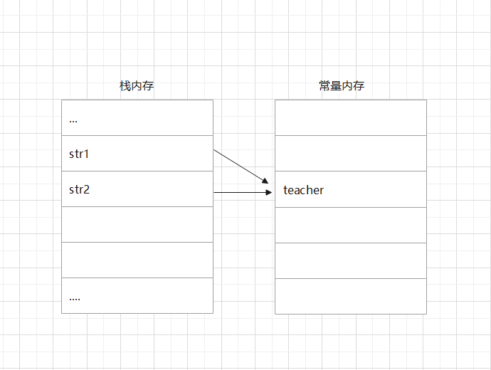 - 格式1:String str1 = “teacher”;程序运行时在常量池中找相同内容的字符串,将其常量池中的地址赋值给对象,常量池中内容相同的字符串的地址是相同的;