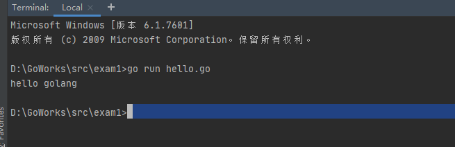 这里需要说的是,一个项目至少要有一个package main和一个main函数,这个和java很像。类似于程序的入口 点击左下角的terminal可以直接进行编译或者运行 可选命令: go build hello.go 此命令可以直接构建一个二进制程序 go run hello.go 此命令不会产生程序但是会执行代码 go install 这个命令是配套 GOBIN一起是用的,需要将环境变量gobin设置制定路径,然后在install的时候可以直接安装,但是感觉用处不是很大。  当输入 go run hello.go 可以出现输出语句的时候表示之前的步骤各位已经跟上做对了。