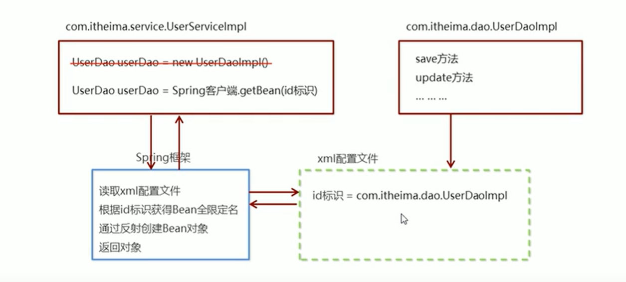 <bean id="userDao" class="com.itheima.ioc.UserDaoImpl"></bean>>