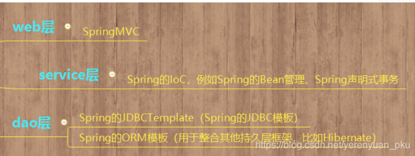 为解决企业开发复杂性的一种轻量级开源框架。spring的简单分层为 web层,service层,dao层