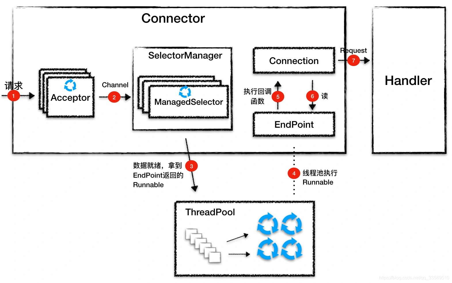 1.Acceptor监听连接请求,当有连接请求到达时就接受连接,一个连接对应一个Channel,Acceptor将Channel交给ManagedSelector来处理 2.ManagedSelector把Channel注册到Selector上,并创建一个EndPoint和Connection跟这个Channel绑定,接着就不断地检测I/O事件 3.I/O事件到了就调用EndPoint的方法拿到一个Runnable,并扔给线程池执行 4.线程池中调度某个线程执行Runnable 5.Runnable执行时,调用回调函数,这个回调函数是Connection注册到EndPoint中的 6.回调函数内部实现,其实就是调用EndPoint的接口方法来读数据 7.Connection解析读到的数据,生成请求对象并交给Handler组件去处理