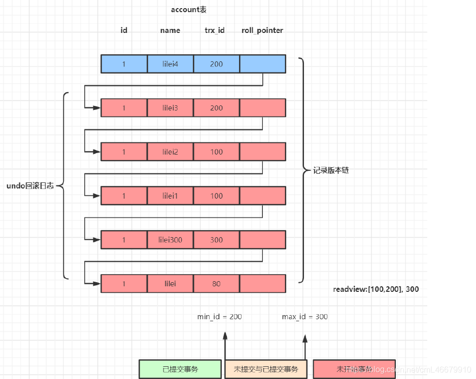 undo日志版本链是指一行数据被多个事务依次修改过后,在每个事务修改完后,Mysql会保留修改前的数据undo回滚日志,并且用两个隐藏字段trx_id和roll_pointer把这些undo日志串联起来形成一个历史记录版本链(见下图,需参考视频里的例子理解)