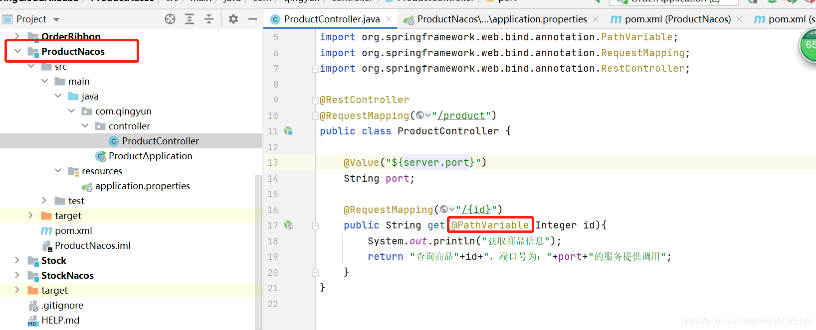 ?(4)系统中再创建一个项目ProductNacos(商品管理系统),提供一个带参数@PathVariable 方式的访问服务。为了后面配置整体日志、指定某个日志方式做准备。
