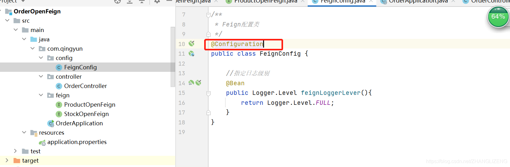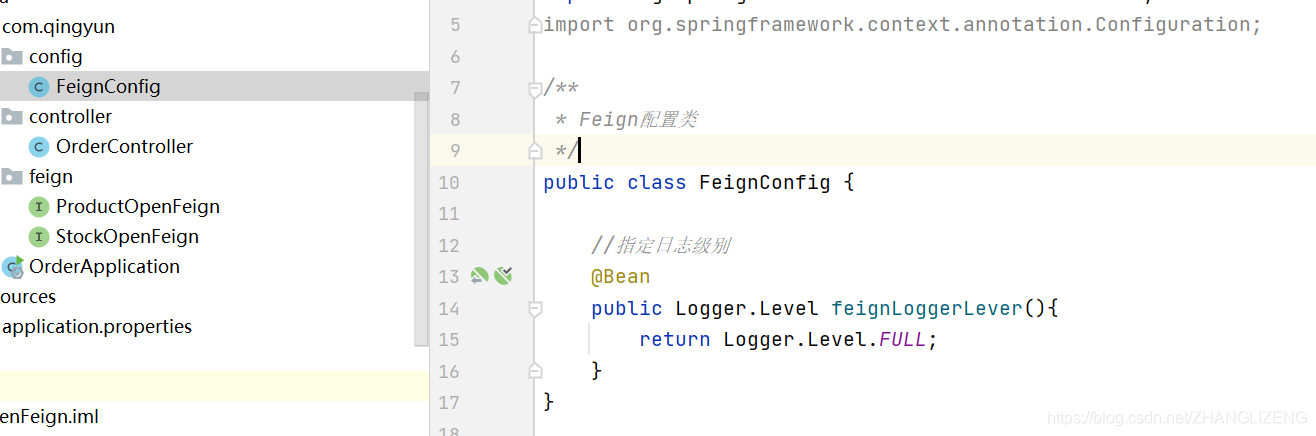(6)配置Feign的日志级别为全局方式,所有的服务都使用这个日志级别,在Feign日志配置类中加注解@Configuration