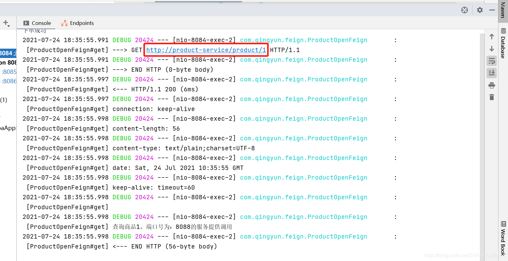 (8)访问服务,查看使用@Configuration全局配置日志的方式,控制台的输出情况:两个服务的feign调用日志都输出来了。