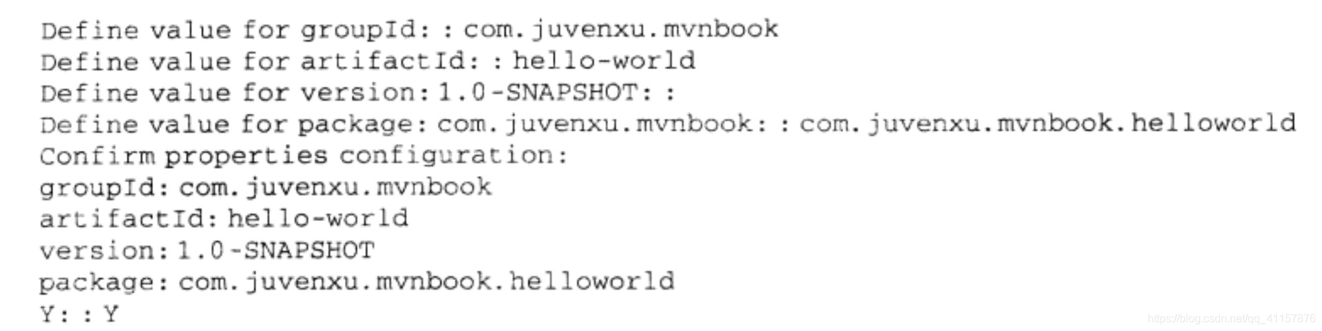 - 接着按提示输入:groupId, artifactId, version, package