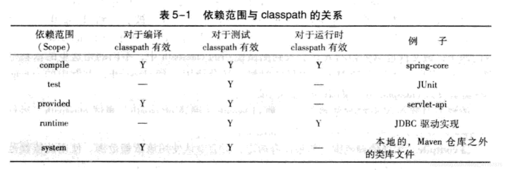 - 概述:用来控制依赖与这三种classpath(编译,测试,运行)的关系,有以下几种选择