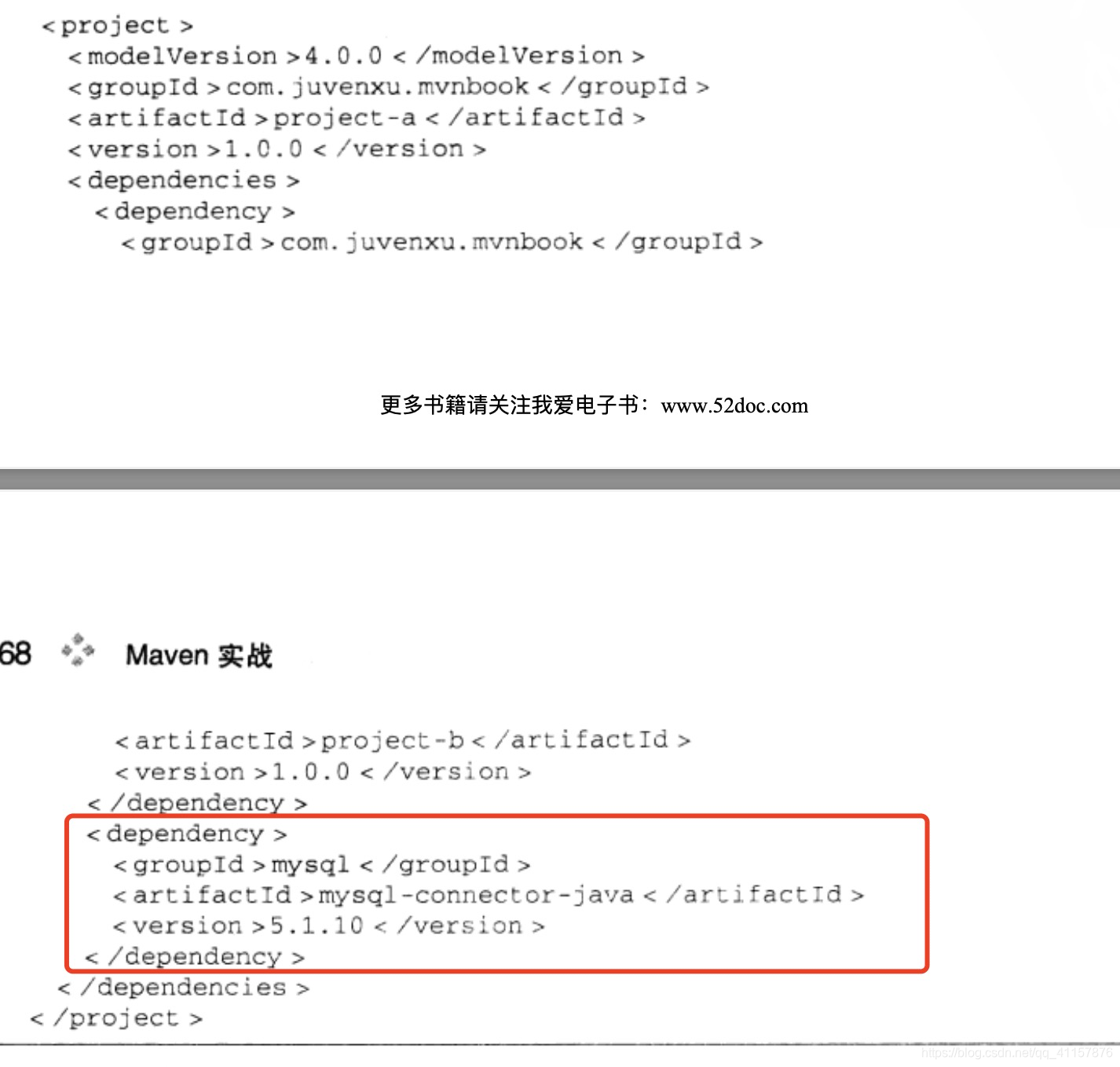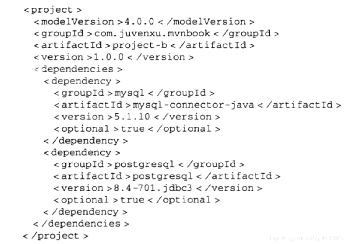 - 例子:B的pom.xml(图一),用户如果要用mysql的jar包,需要在A中自己手动引(下图)