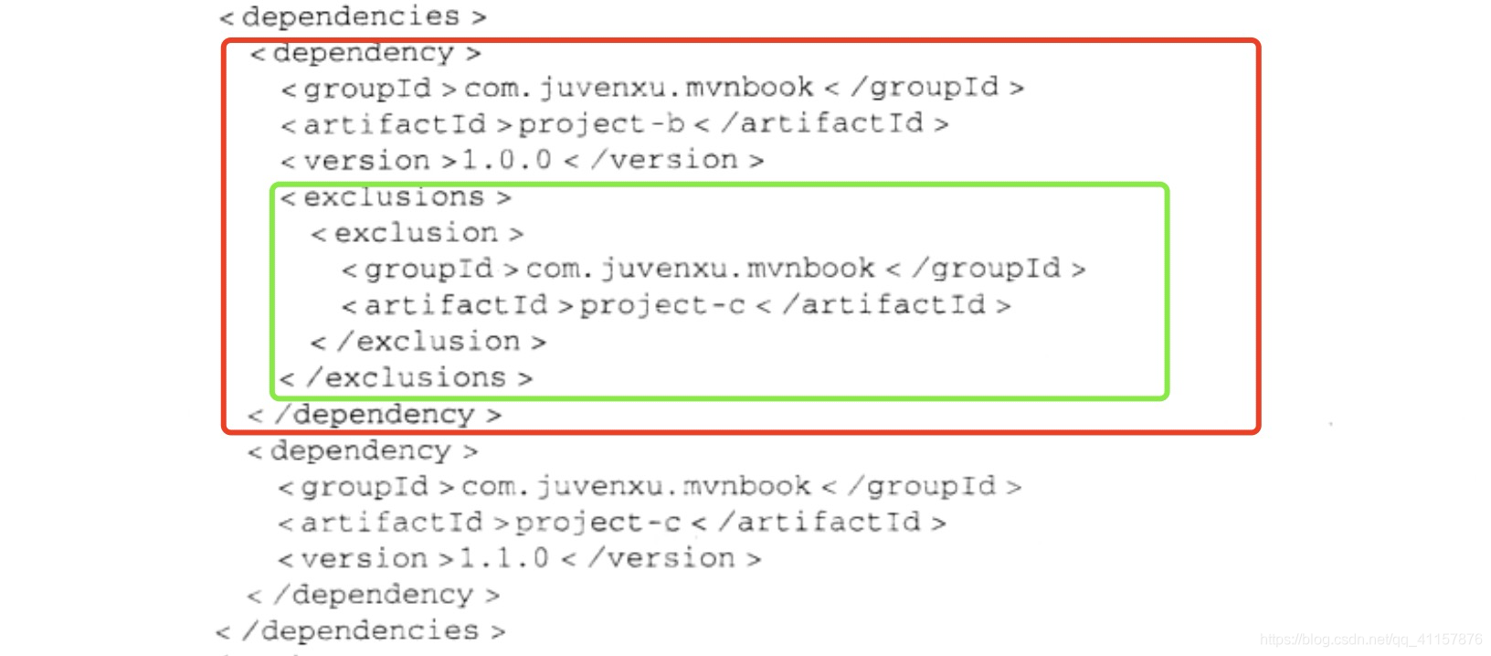 - 假如项目里有个第三方依赖,该依赖还依赖了另一个1.0.0-SNAPSHOT版本的库,那么该1.0.0-SNAPSHOT就会成为当前项目的传递性依赖。此时我想排除该依赖,则要使用<exclusion>标签
