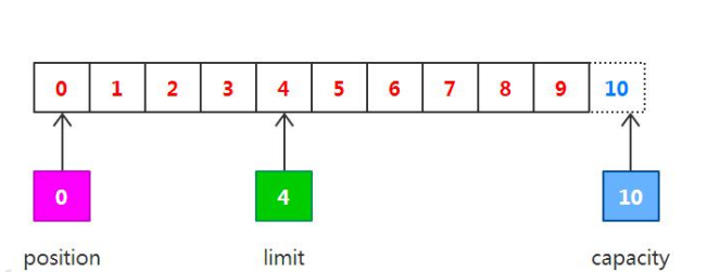 运行结果我们已经可以知道,四个属性值分别如图所示:  我们可以从管道中读取一些数据到缓冲区,注意从通道读取数据,相当于往缓冲区写入数据。如果读取4个自己的数据,则此时position的值为4,即下一个将要被下入的字节索引是4,而limit仍然是10,如下图所示: