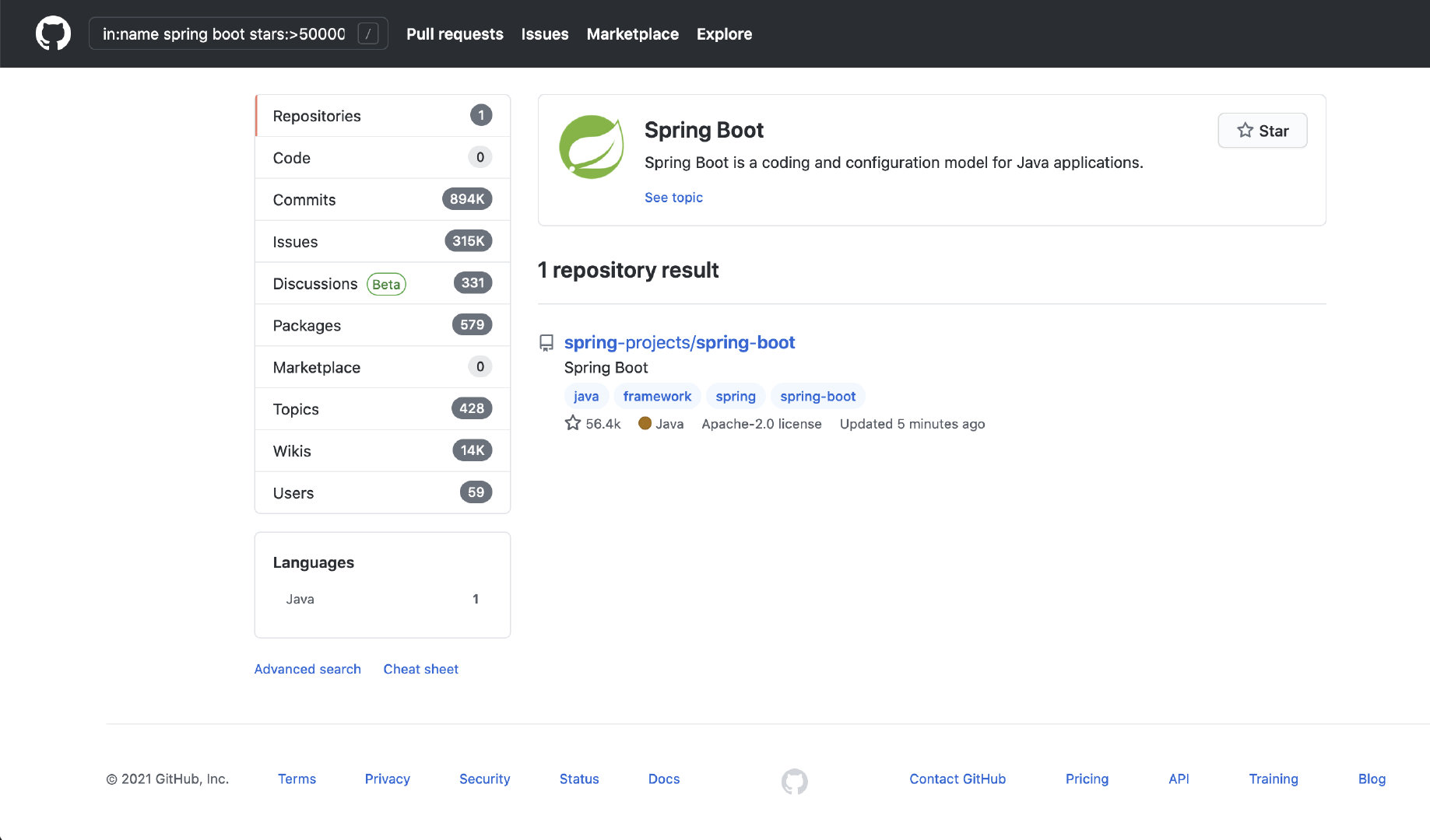 在github中对项目进行搜索的时候,可以针对项目的 名称、描述、readme、star数量、fork 中的内容进行精确搜索(而不是直接在搜索框中输入笼统的名字出来一堆不感兴趣的东西) 下面列举的条件都可以并行使用 以Spring Boot为例 一、关键字出现的位置 1、出现在项目名中