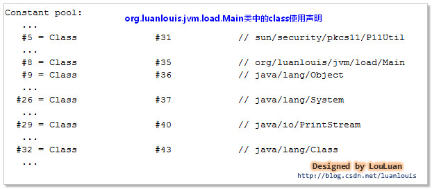ClassLoader classloader = launcher.getClassLoader();//取得AppClassLoader类 classLoader.loadClass(“com.jon.StudyClassLoader”);//加载自定义类 上述定义的ocom.jon.StudyClassLoader类被编译成com.jon.StudyClassLoader class二进制文件,这个class文件中有一个叫常量池(Constant Pool)的结构体来存储该class的常量信息。  当AppClassLoader要加载 com.jon.StudyClassLoader类时,会去查看该类的定义,发现它内部声明使用了其它的类: sun.security.pkcs11.P11Util、java.lang.Object、java.lang.System、java.io.PrintStream、java.lang.Class;org.luanlouis.jvm.load.Main类要想正常工作,首先要能够保证这些其内部声明的类加载成功。所以AppClassLoader要先将这些类加载到内存中。(注:为了理解方便,这里没有考虑懒加载的情况,事实上的JVM加载类过程比这复杂的多)