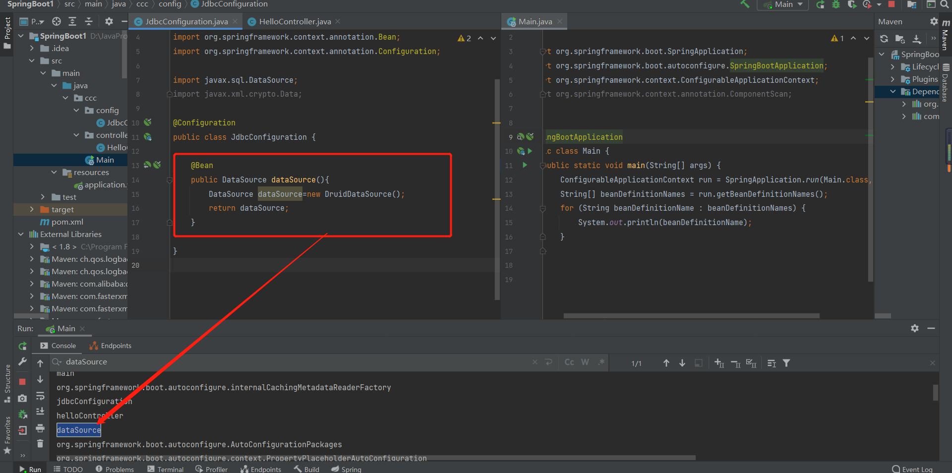 - 而当在@Configuration 中默认proxyBeanMethods为true时,也就是说这个类如果通过getBean拿出来,就成了一个代理对象,而不是原来的对象。所以如果通过getBean拿出这个配置类(在容器中),再调用方法(如图为dataSource),则都是从容器中拿出来。也就是说是单例。