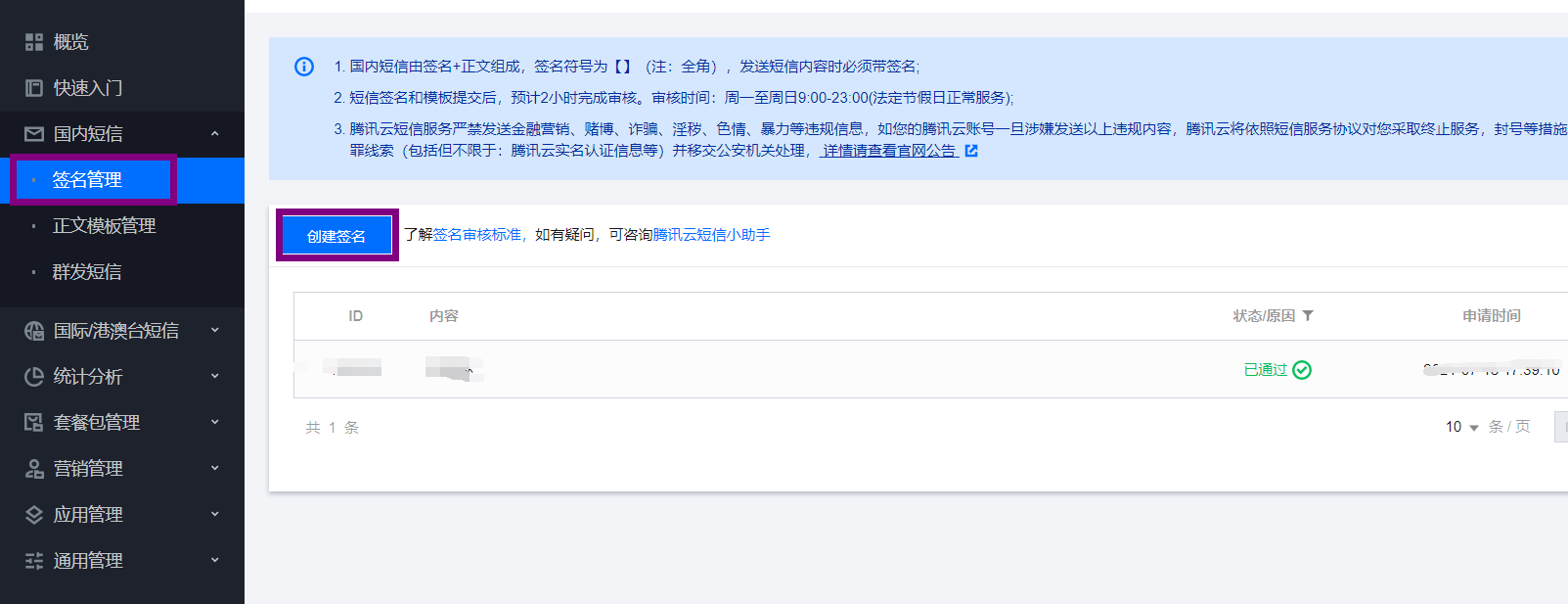 首先:点击签名管理,创建签名