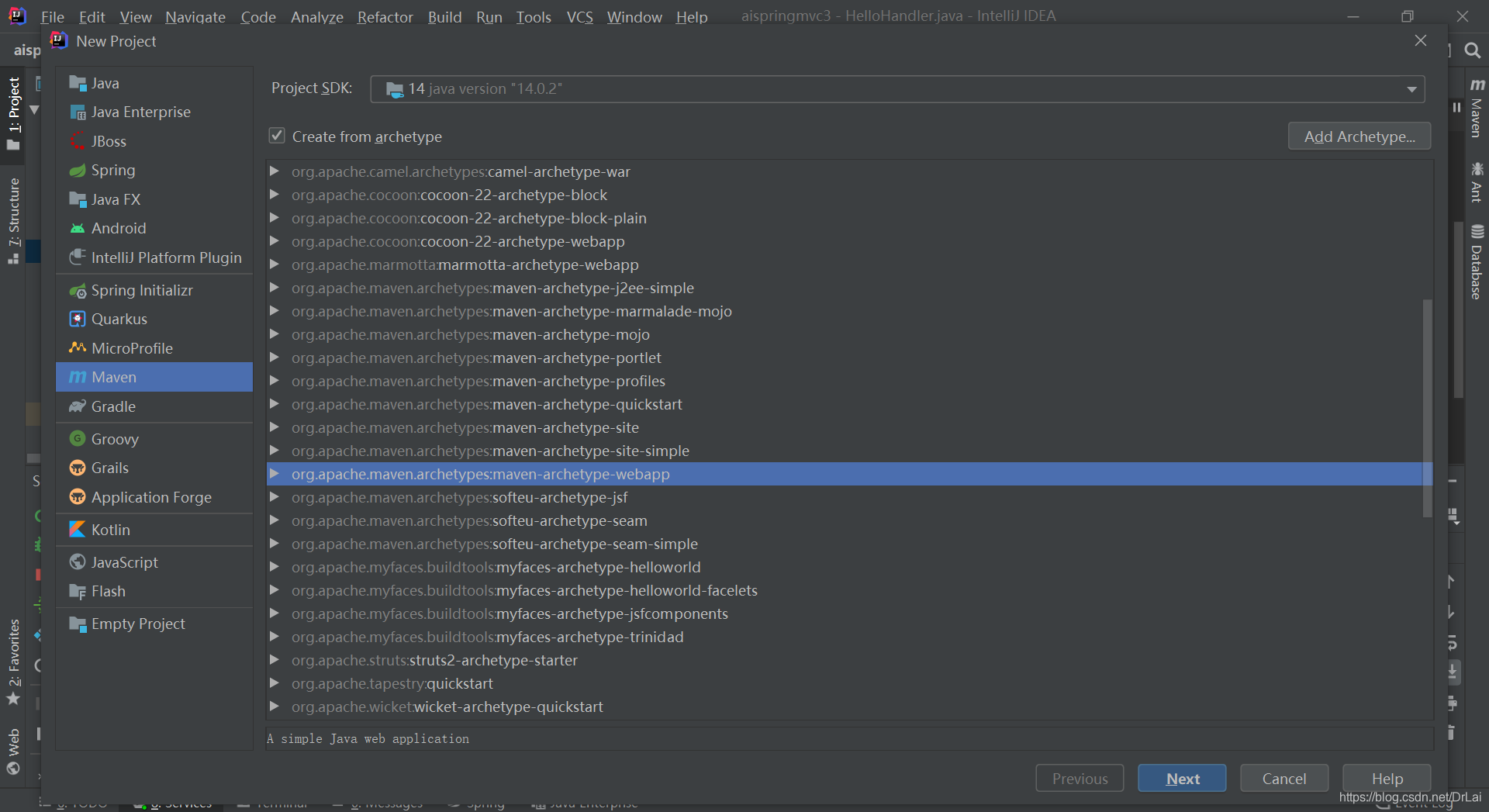 1新建工程,在maven工程中选择create from archetype,选择webapp,注意有很数个webapp,要选择前缀有maven的