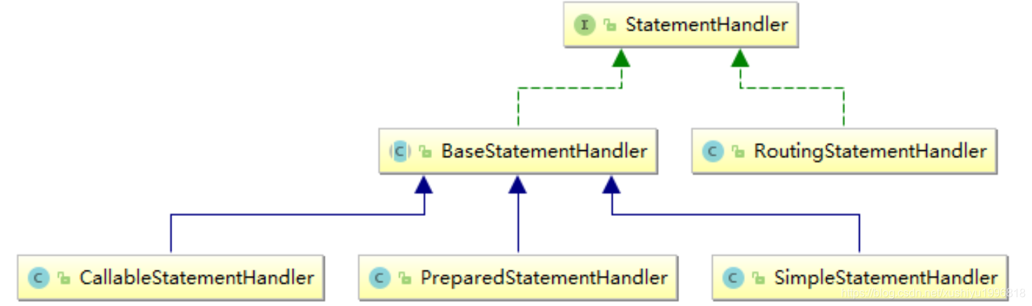 是一个抽象类,它实现了StatementHandler接口,用于简化StatementHandler接口实现的难度,采用适配器设计模式,它主要有三个实现类SimpleStatementHandler、PreparedStatementHandler和CallableStatementHandler。