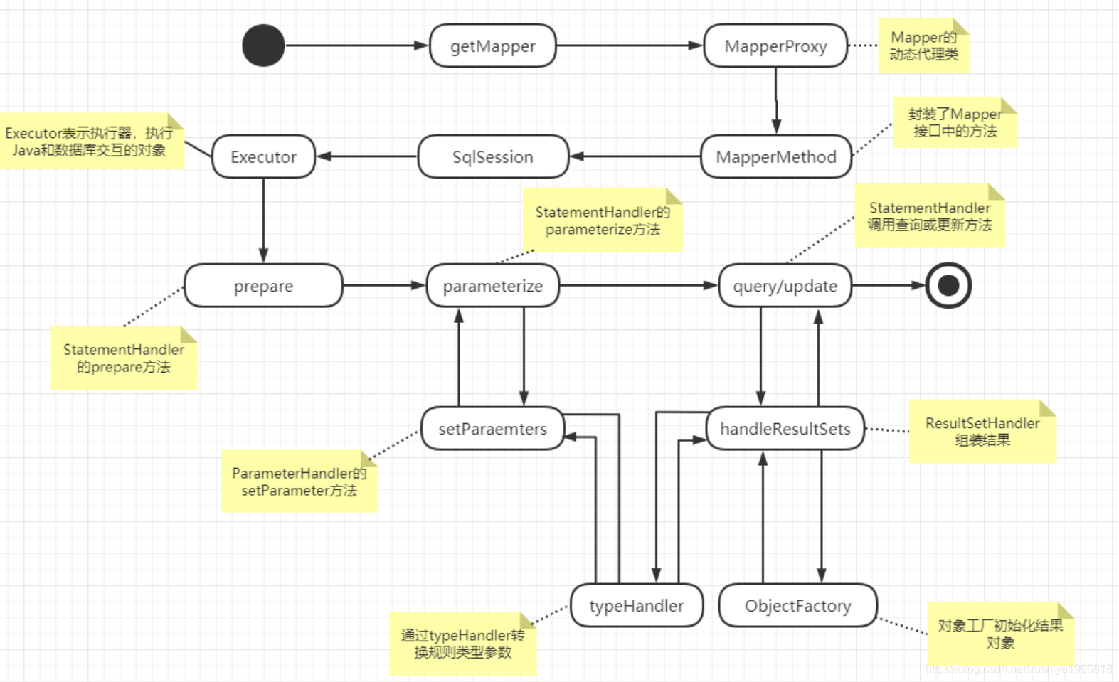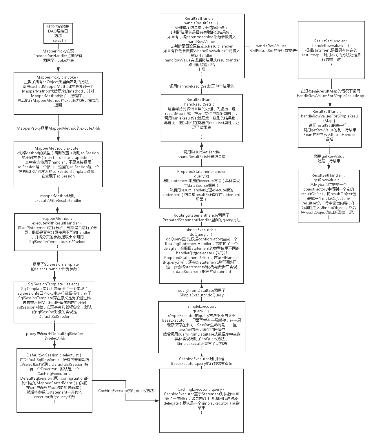 如果是查询,MyBatis则会使用ResultSetHandler来封装结果并返回给调用者,从而完成查询。其执行的完整流程图如下:
