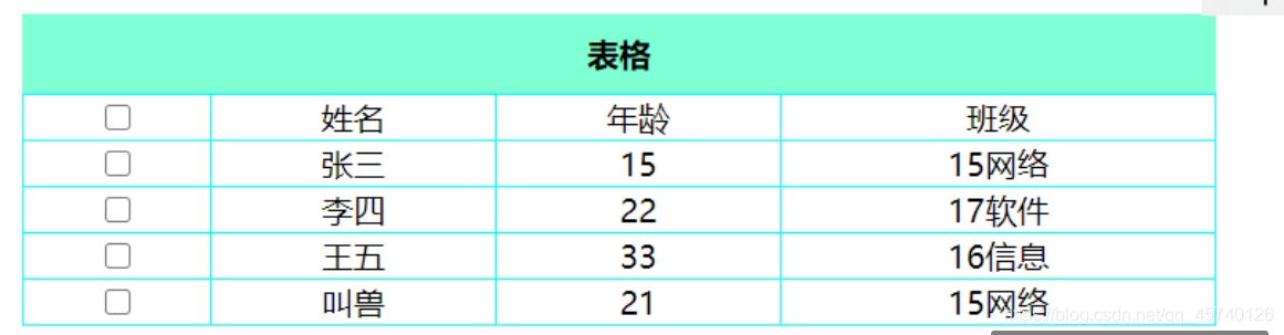 <th align="center" style="background: aquamarine" colspan="4" height="40px">表格</th>