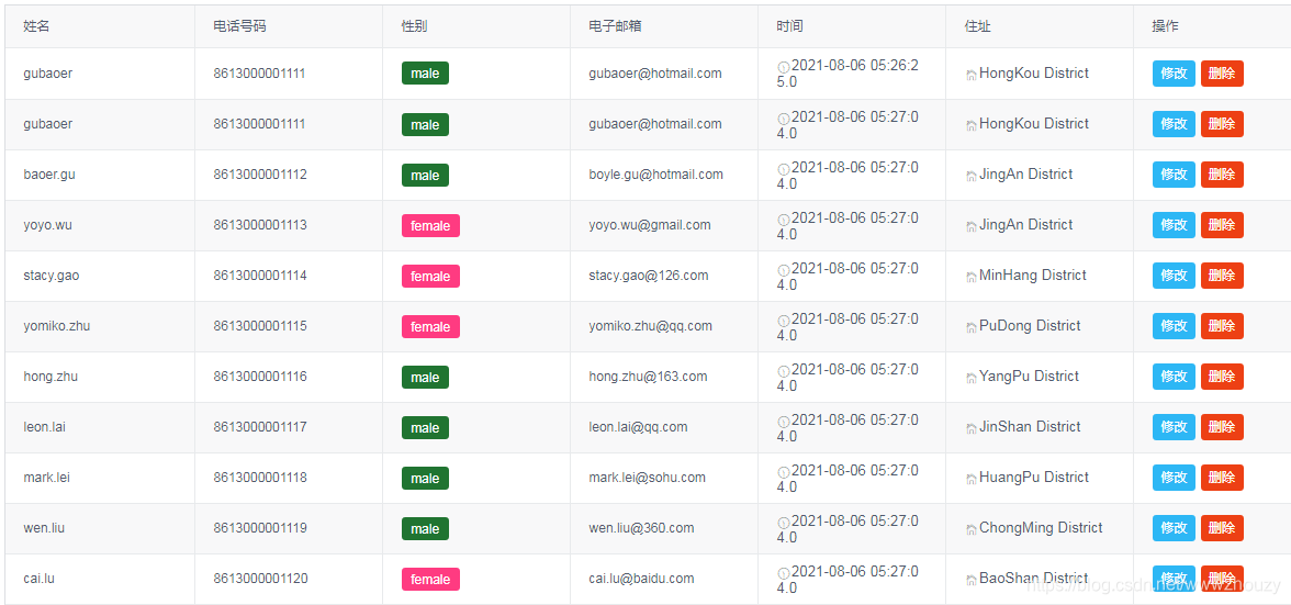 INSERT INTO `zhouzy`.`persons` (`id`, `create_datetime`, `email`, `phone`, `sex`, `username`, `zone`) VALUES ('2', '2021-08-05 21:27:04', 'gubaoer@hotmail.com', '8613000001111', 'male', 'gubaoer', 'HongKou District');