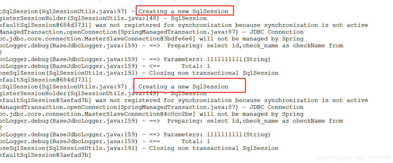 可以看到SQL执行了两次。也就是说在非事务的情况下,每次查询都会创建一个新的SqlSession,这时候没有用到一级缓存,但是缓存其实是存在的,从直观的角度我们可以认为这时候mybatis的一级缓存是失效的。