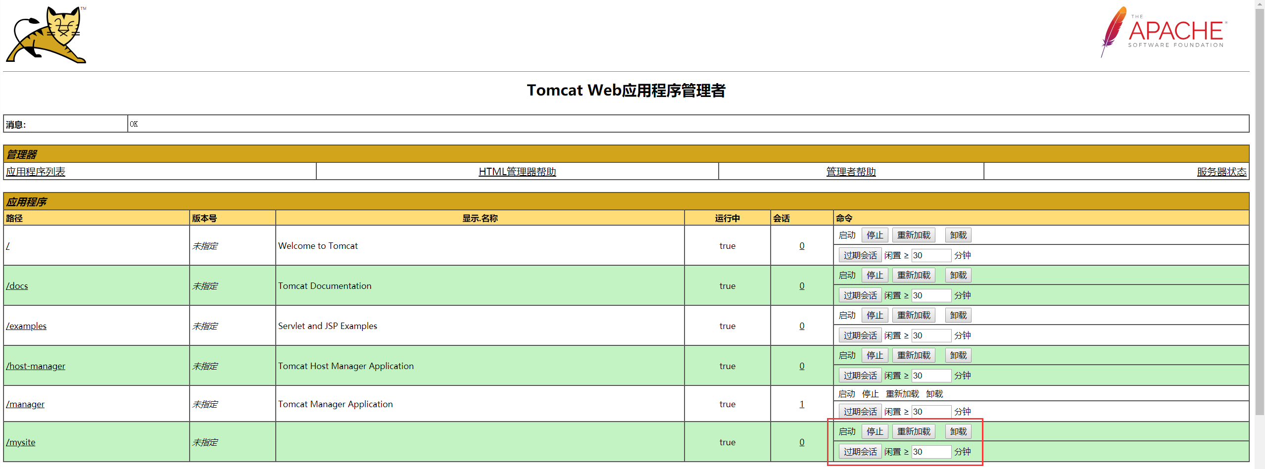 部署成功后,会有如下信息,并且会将代码自动 copy 到 tomcat 定义好 appBase 目录并可以 直接访问  注意事项: 可以通过 manager app 卸载此 webapp,卸载后立即将 appBase 目录中的 site3 目录删除, 但是重启tomcat 不会删除 site2 目录。