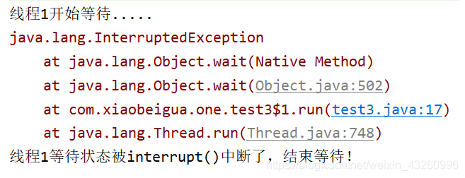System.out.println("线程1等待状态被interrupt()中断了,结束等待!");