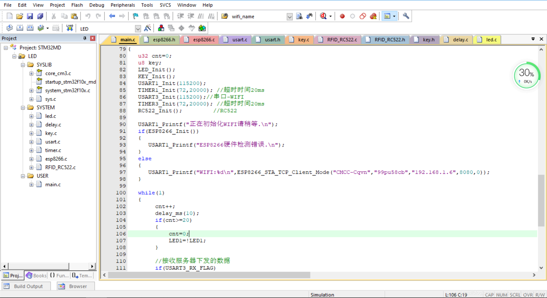 - ESP8266WIFI初始化工作在STA模式,连接到指定WIFI,与软件所在的电脑处于同一个局域网,方便连接软件端的服务器进行数据通信,每次设备开机将会自动连接到程序里设置好WIFI热点和服务器。