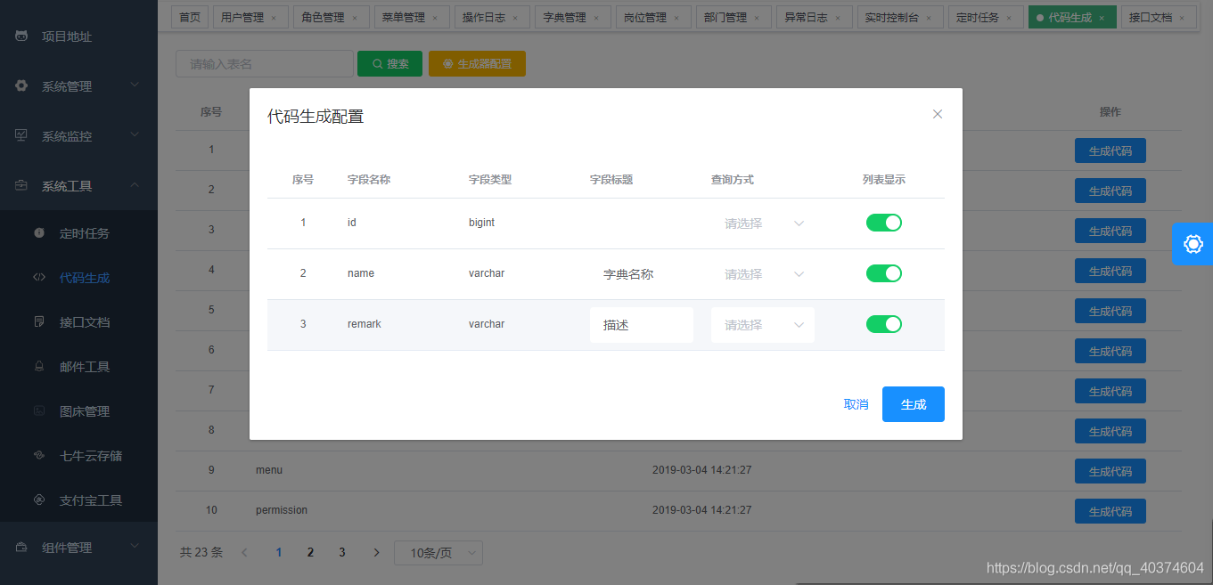 eladmin-generator 为系统的代码生成模块,代码生成的模板在 system 模块中