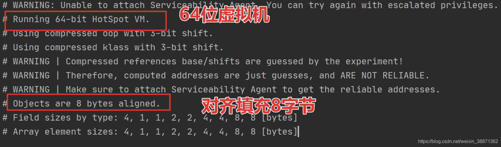 得出以下内容:  OK了,相关信息打印出来了,记住这是myclass的相关内部信息,那这些都是啥呢?看上面的图,是不是有个“Object header” 就是对象头 ?  这是啥?主要就是来看我们的一个空对象占多大空间,之前也说了,对象头包括对象标记8字节和类型指针8字节,我们先来看对象标记,是不是这个: