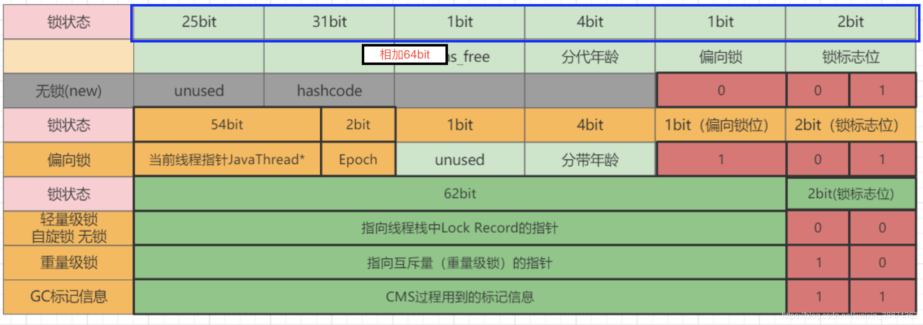 对于一个Java对象来说,对象头是极其重要的,对象头主要有对象标记和类型指针两部分组成,接下来需要重点看下对象标记,也就是Mark Word,下面是针对64位JVM(那也就是说还有32位的,考虑到现在基本都是64的了,32的直接pass掉)的Mark Word来说的,它的组成是这样的: