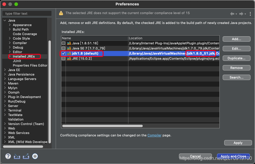 Ps:有很多小伙伴在打包的时候会爆jdk相关的异常,这种情况大部分是因为eclipse中jdk的路径没有配置好导致的,一定要是jdk的路径而不是jre的路径,如图配置: