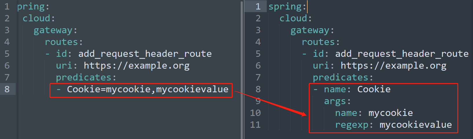 - 上述配置信息中的predicates是简化版配置,和完整配置对比效果如下,简单的说就是把一行拆成了三项:name、args.name、args.regexp