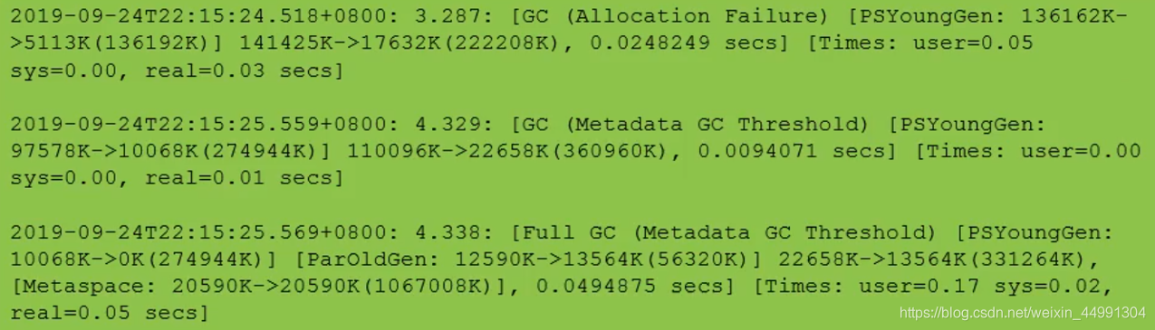 GC,Full FC: 同样是Gc的类型 Allocation Failure: GC原因表明本次引起GC的原因是因为在年轻代中没有足够的空间能够存储新的数据了。 pSYoungGen: 使用了Parallel scavenge并 行垃圾收集器的新生代GC前后大小的变化 ParoldGen: 使用了Parallel Old并 行垃圾收集器的老年代GC前后大小的变化 Metaspace: 元数据区GC前后大小的变化,JDK1.8中引入 了元数据区以替代永久代 XXX secs: 指GC花费的时间 Times: user:指的是垃圾收集器花费的所有CPU时间,sys: 花费在等待系统调用或系统事件的时间,real:GC从开始到结束的时间,包括其他进程占用时间片的实际时间。