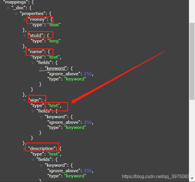 ?查看mapping映射,sign的类型我们设置的是keyword,但是es还是映射成text,这是es的问题,我们先不管。