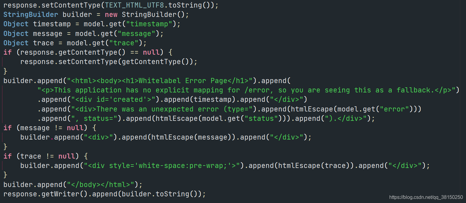 ? ? ? ? 一开始以为默认页面会是某个静态的 html ,但是找了半天没找到。后来在?ErrorMvcAutoConfiguration 配置类中找到了这段代码