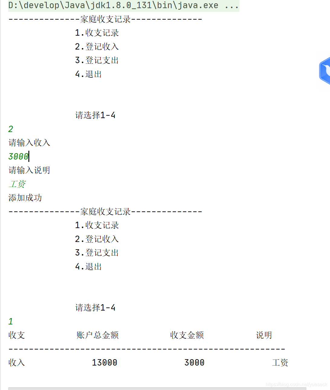 用于收入和支出金额的输入。该方法从键盘读取一个不超过4位长度的整数,并将其作为方法的返回值。
