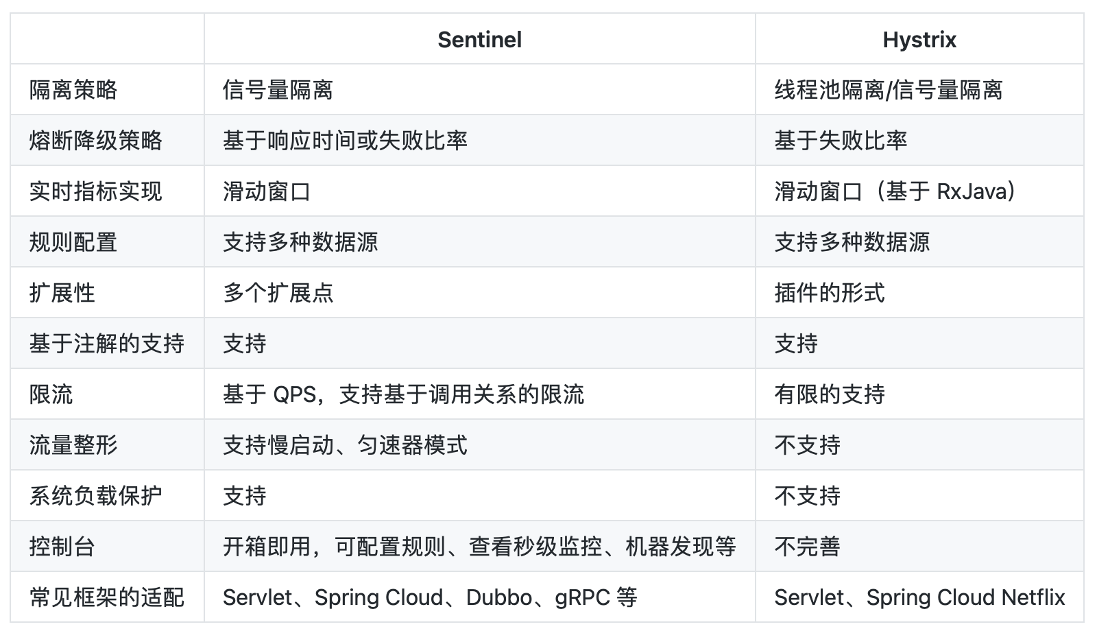 Sentinel和Hystrix对比