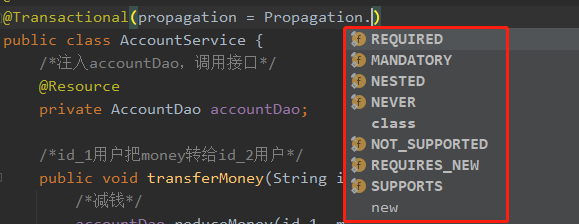 然后我们就可以在Service类或者Service类中的方法上边添加事务注解@Transactional 添加在类上边表示,为这个类的所有方法添加事务 添加在方法上边,表示只为这个方法添加事务