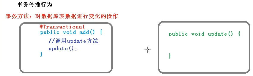 Spring框架事务传播行为有7种:(常用的是REQUIRED和REQUIRED_NEW) 以下描述都是针对给update加事务并附上以下各种属性而论。  SUPPORTS:如果add有事务,那么update在add中运行,否则update在自己的事务中运行。 NOT_SUPPORT:如果add有事务,那么将add挂起,update运行在自己的事务中。 MANDATORY:update只能被有事务的方法调用,如果add方法不是事务,那么调用update的时候,抛出异常。 NEVER:update不能被有事务的方法调用,如果add方法是事务,那么抛出异常。 NESTED:如果add方法是事务,那么update在add事务的嵌套事务内运行,否则,update自己启动一个新的事务,并在自己的事务内运行。