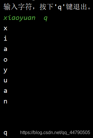 System.out.println("输入字符,按下'q'键退出。");