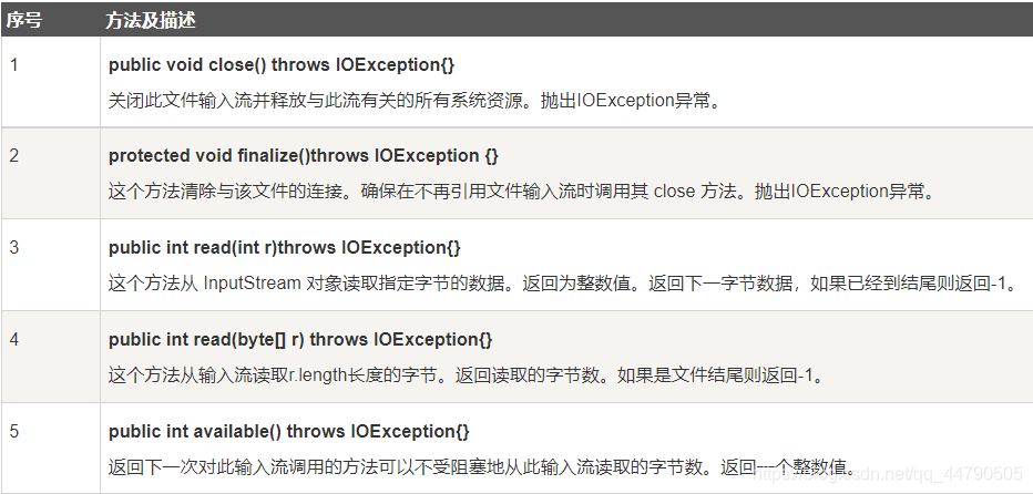 每次调用read()方法,他就会从输入流读取一个字符并把该字符作为整数值返回。当流结束的时候返回-1.抛出IOException。
