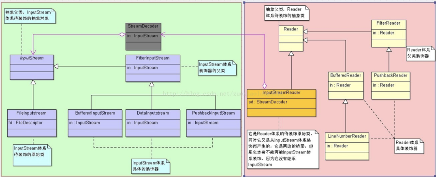适配器角色就是InputStreamReader, 被适配的角色是InputStream类的实例对象,目标接口是Reader类。 可以看到,InputStreamReader实现了Reader接口,并且持有了InputStream的引用,这里是通过StreamDecoder类间接持有的,因为从byte到char 要经过编码。 适配器在IO中的体现:将InputStream实现类通过InputStreamReader装换类适配成Reader接口实现类,将OutputStream基类实现类通过OutputStreamWriter适配成Writer基类的实现类