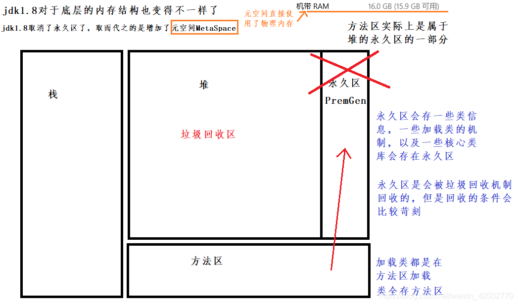 jdk1.8对底层做了优化,使得速度更快了。jdk1.8取消了永久区,取而代之的是增加了元空间(MetaSpace),元空间直接使用了物理内存(RAM),因此运行速度会更快。