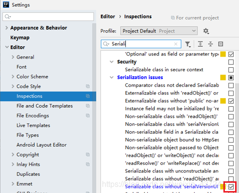【小总结】:我们想要序列化和反序列化的对象,都要实现 Serializable 这个接口,且最好手动给它加上一个自定义的序列化版本号。 另外,我们在 IDEA 中也可以设置自动生成序列化对象的代码,设置方法如下:将√取消掉,然后apply,OK。  设置完之后,只要实现了 Serializable 接口的类,可以将光标停在该类上,然后按 “Alt + Enter”,就能手动添加序列化版本号了。