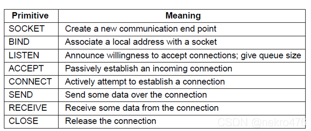 服务原语 | Server端 | Client端 | SOCKET创建一端的socket,也是一个通信的线程,允许有多个 | ServerSocket server = new ServerSocket(PORT); 默认绑定本地IP,端口号PORT需要在初始化中定义 | Socket socket = new Socket(); 默认绑定本地IP | BIND将socket与本地地址绑定 | LISTEN监听连接的请求 | Socket?socket =?server.accept(); 此时线程阻塞,监听来自Client端的连接,当Client端发起connect命令 | | ACCEPT被动的接收连接请求 | CONNECT主动发起请求 | | socket.connect(IP:PORT); | SEND | socket.getOutputStream(); | RECEIVE | socket.getInputStream(); | CLOSE主动断开请求 | socket.close(); |