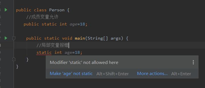 3.static不能作用于局部变量 在Java中切记:static是不允许用来修饰局部变量。static是说明这个东西是属于整个类的 而局部变量的作用域只能在他所属的{}之内。不可能是属于类或对象的。 这个是矛盾的,所以static不能修饰局部变量